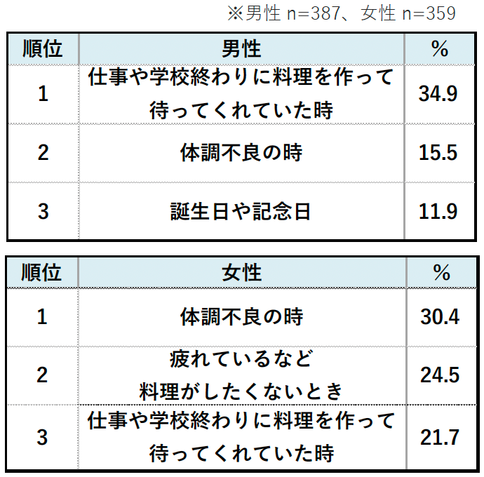 ■男女の1位は「料理を作って待ってくれていた時」と「体調不良の時」男性と女性で意識の違いあり