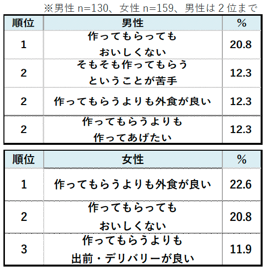 「うれしくない」/作ってもらうよりも一緒に作りたい、作ってもらうよりも作ってあげたい、そもそも作ってもらうということが苦手、作ってもらってもおいしくない、作ってもらうよりも外食が良い、作ってもらうよりもスーパーやコンビニ、テイクアウトが良い、作ってもらうよりも出前・デリバリーが良い、その他【自由回答】