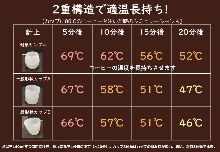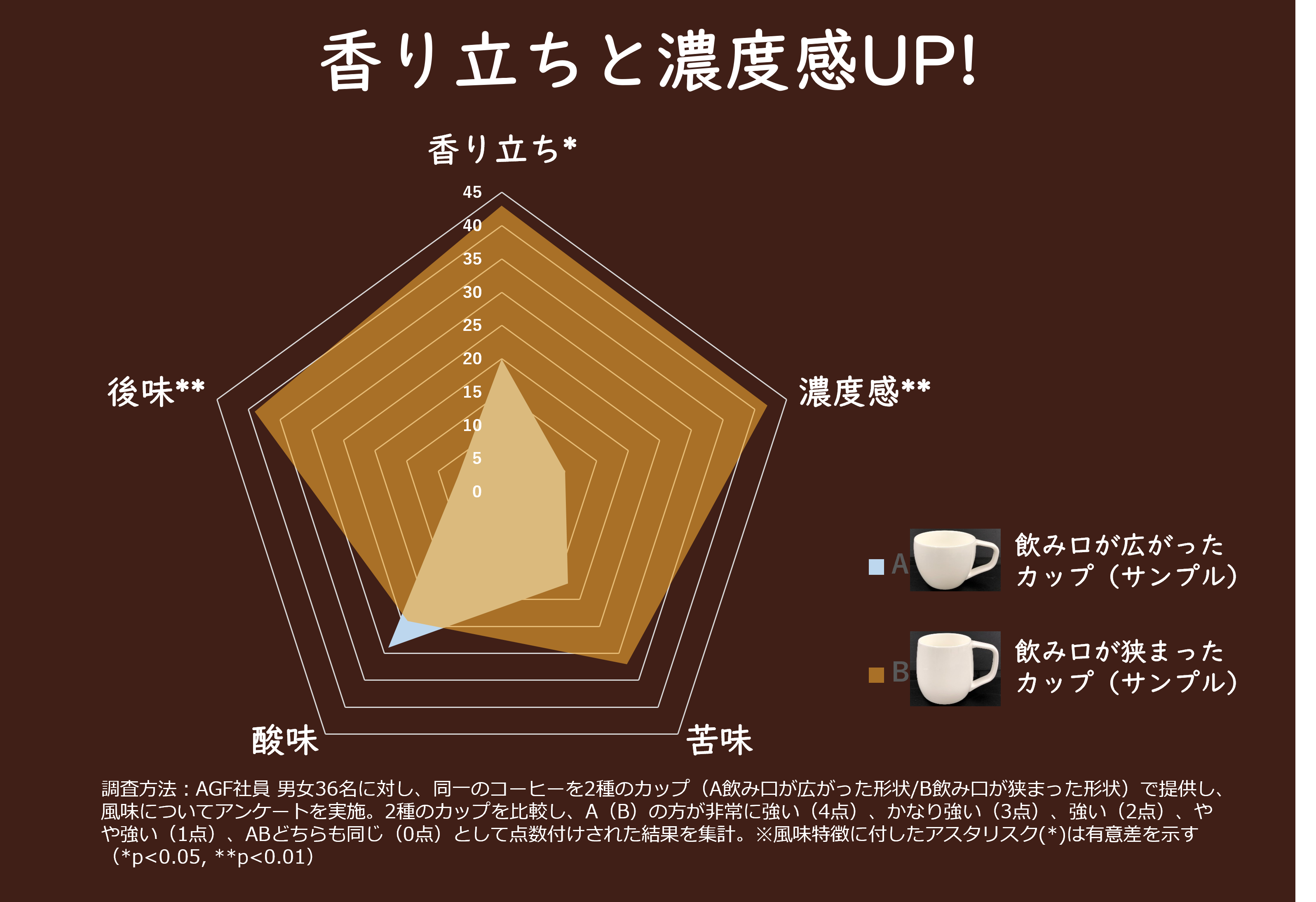 味の素AGFの工場でコーヒー豆の品種の切り替え時に生じるコーヒーの副産物や規格外の コーヒーを原料にして作られたカップです。<Black>と<Latte>の2種を開発しました。味の素AGFのコーヒー開発の知見を活かし、味覚・嗅覚研究を経て、「コーヒーの香りがひきたつ」形状を実現しました。広い液面からうまれた香りをカップ内にとどめるデザインにすることで芳しい香り立ちを際立たせ、コーヒーの味わいをはっきりと感じることができます。下半分は二重構造となっているため熱が逃げづらく、コーヒーの温度が長持ちします。