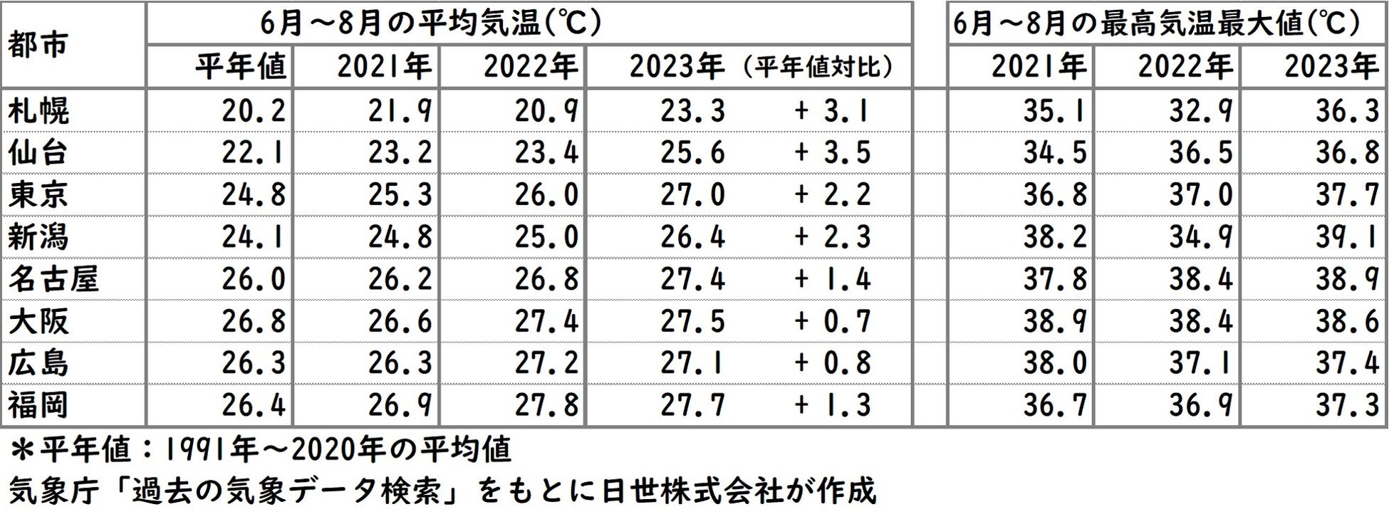 気象庁の「過去の気象データ検索」でふり返ると、過去3か年の6~8月の平均気温は、年を追うごとに高くなり、2023年は平年値を最大3.5℃上回る地域が現れました。最高気温の最大値は軒並み体温並の高さを記録しています。