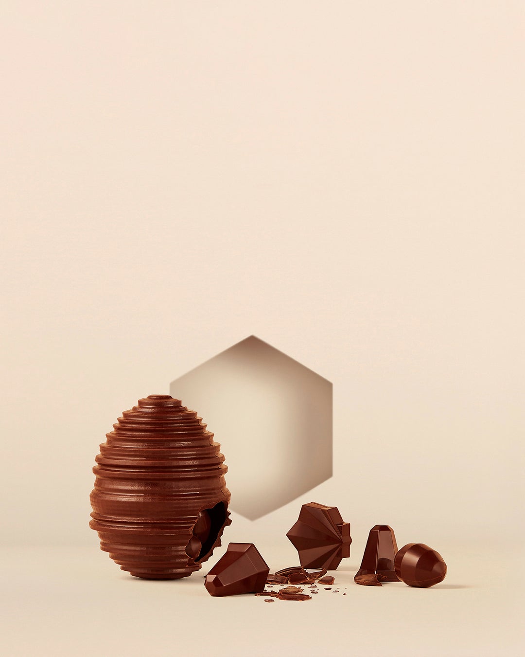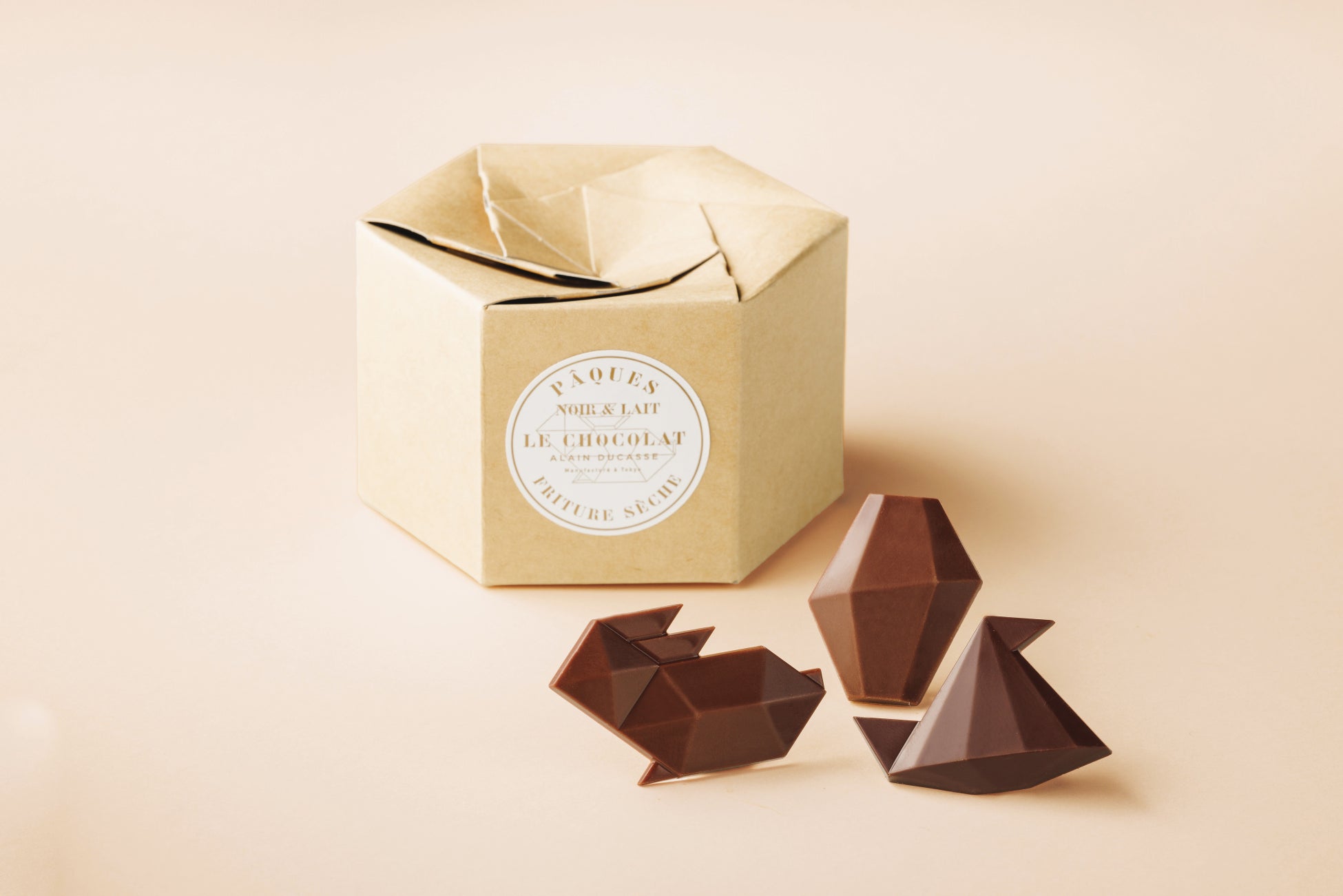 2024年のイースター・コレクションの新作として、宝石のようにシャープなカットがスタイリッシュなイースターエッグをはじめ、ヒヨコのパターンが幾何学的にデザインされたタブレット、またブランドを象徴する六角形のショコラ“エグザ”シリーズは、愛嬌あるカモとキツツキのレリーフの2種類で展開します。そのほか、回転する卵にインスパイアされたアートのようなイースターエッグやイースターモチーフのフリチュールなど、毎年この時期限定で登場する人気の定番商品も販売します。