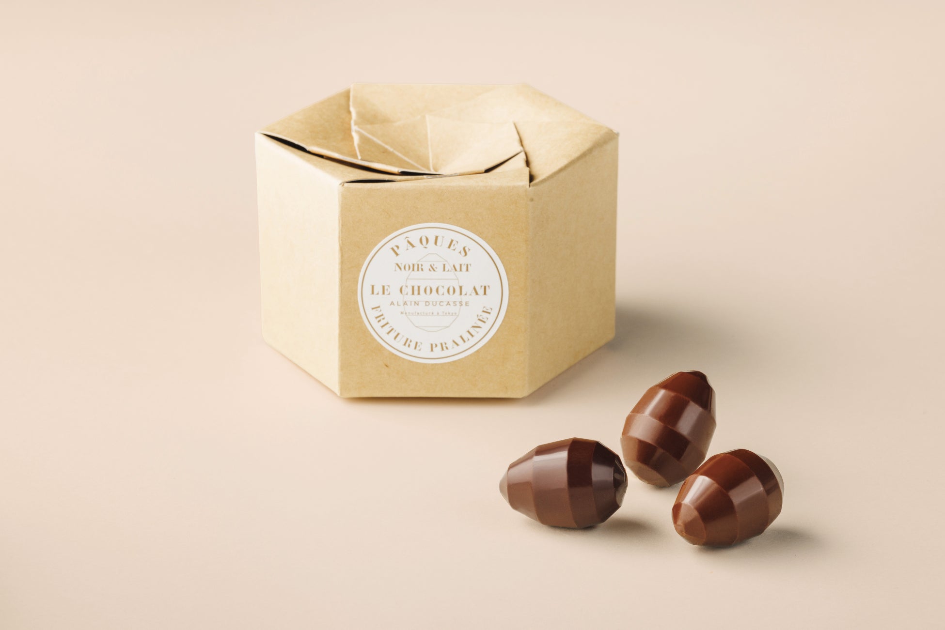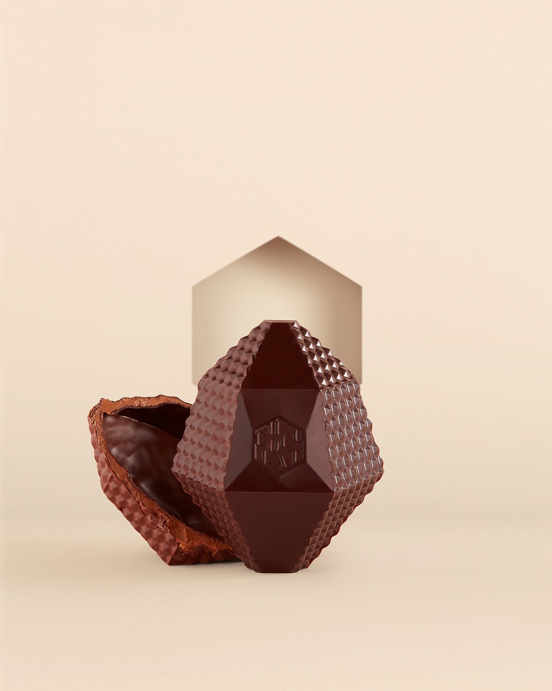 クリエイティブで才能溢れるショコラティエとデザイナーによって作られたイースターエッグは、宝石のようなファセット・カットのデザインが施されたスタイリッシュなフォルム。芳醇な風味のアーモンドとヘーゼルナッツのプラリネにショコラを重ねています。ショコラ ノワール(カカオ75% オリジナルブレンド)とショコラ オ・レ(マダガスカル産カカオ45%)の2面仕立てで、両方の味わいをお楽しみいただけます。