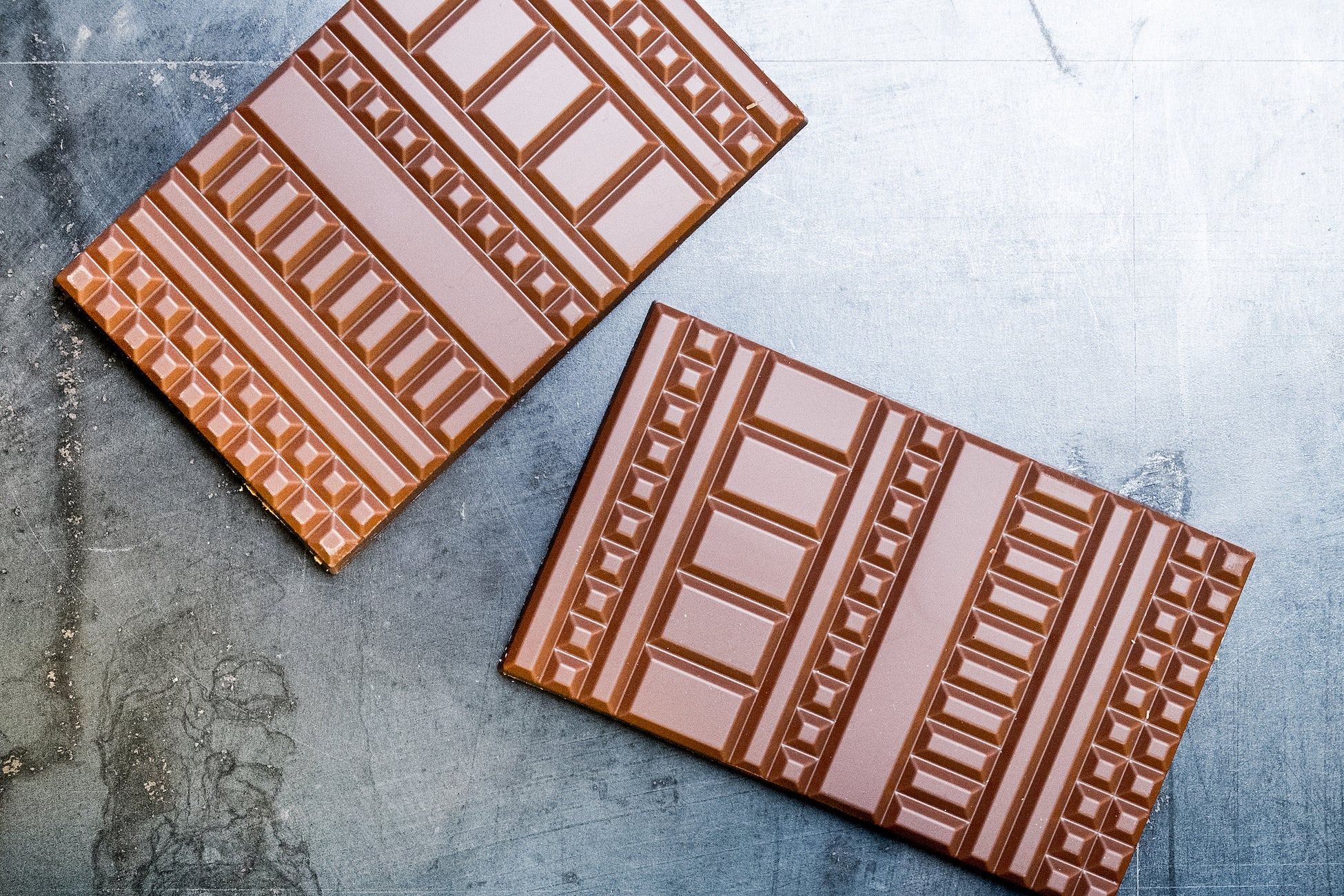 幾何学デザインのヒヨコがパターンとなってデザインされたタブレット・ショコラ。フランス語でフルール・ド・セル(塩の花)といわれるゲランドの塩をアクセントに加えています。オ・レ(マダガスカル産カカオ45%)とノワール(カカオ75% オリジナルブレンド)の2種をご用意しました。