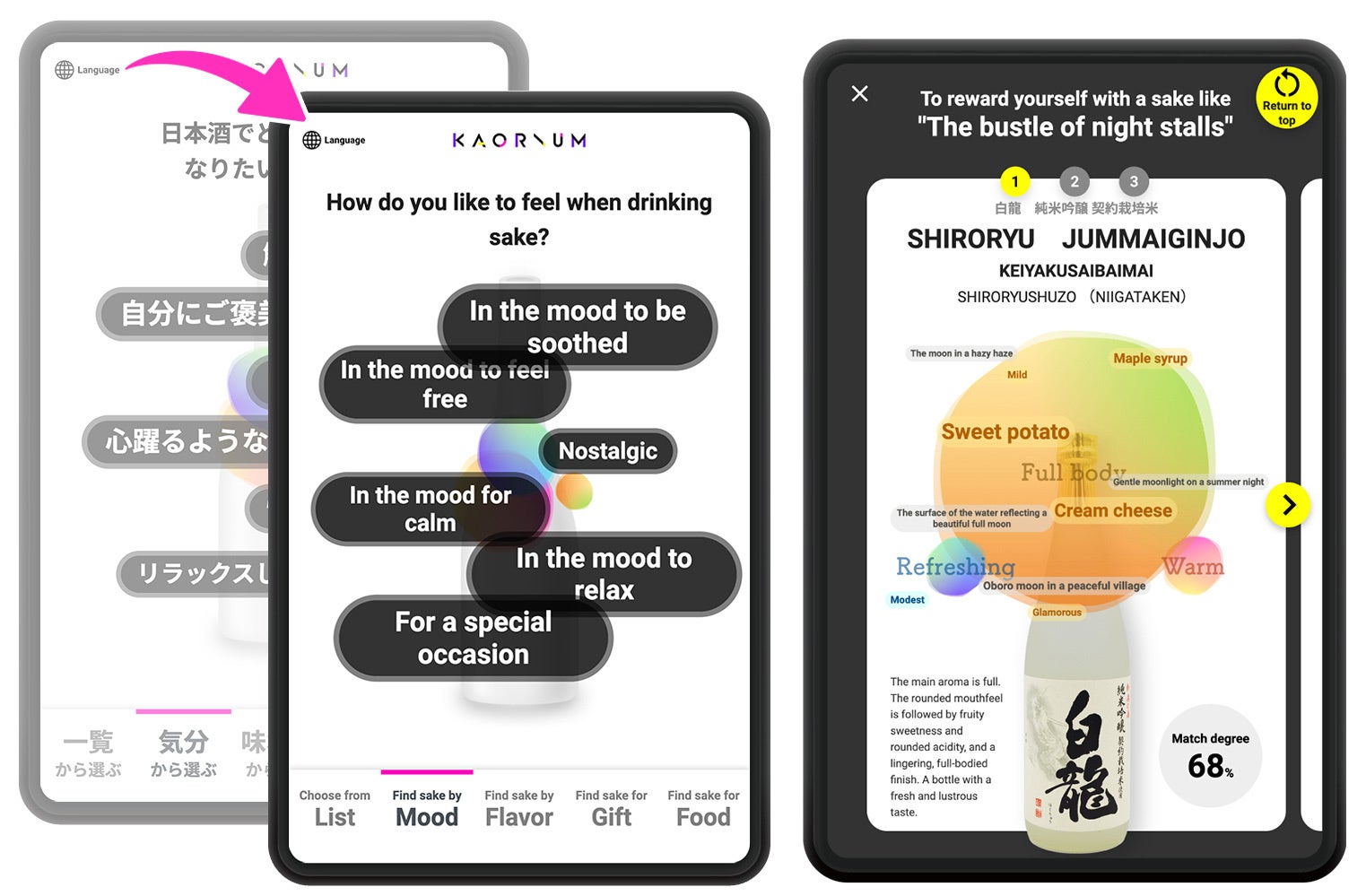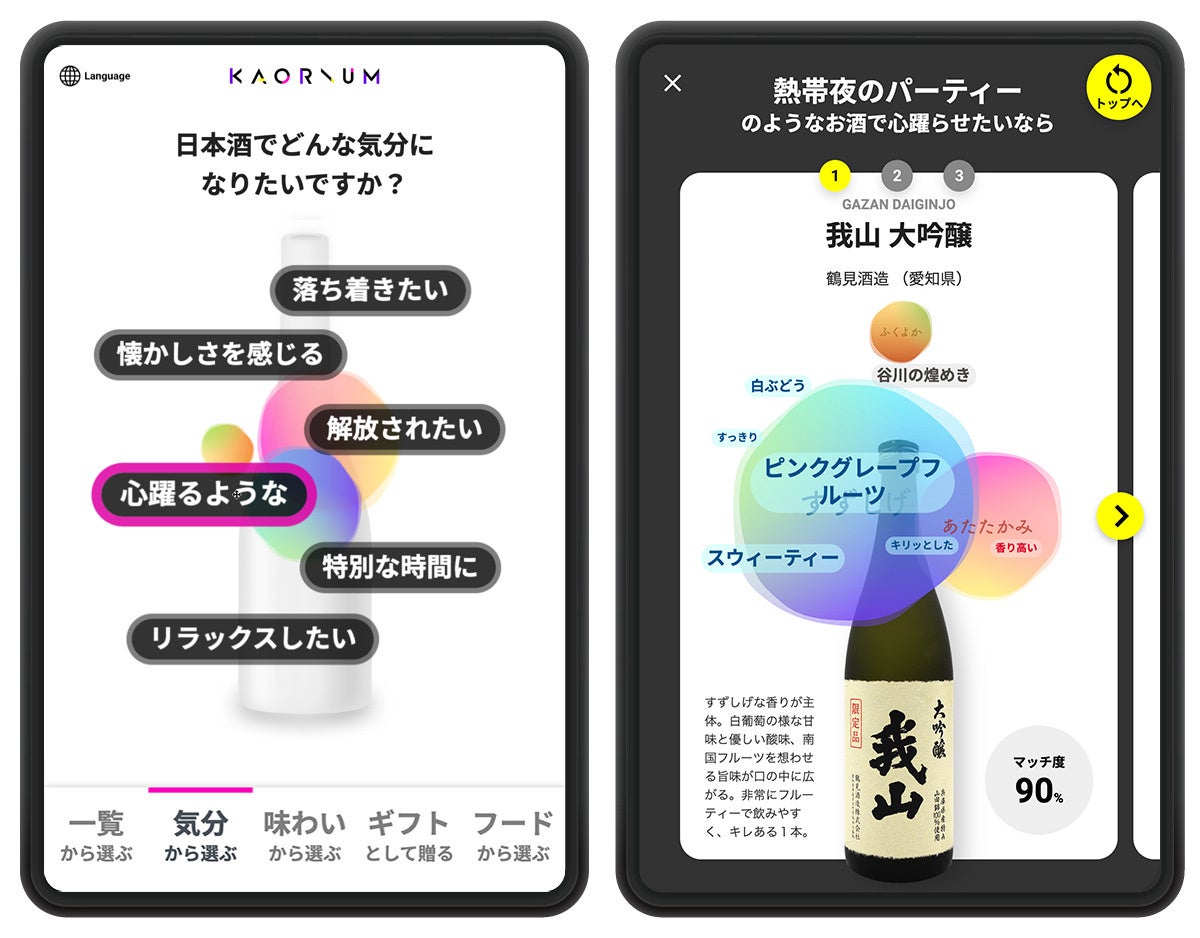 日本酒ソムリエAI「KAORIUM for Sake」は、インターネット上の膨大な言語表現と人の香りの感じ方を学習したAIに、1万以上の日本酒の風味・感性データと酒ソムリエの感性を融合させた最先端のAIシステムです。自然言語処理によって、表現の難しい日本酒の風味を、わかりやすい言葉で表したり「解放されたい」「ワクワクしたい」といったなりたい気分や、「個性的」「フルーティ」といった好みの味わいに合わせて、AIが店頭にある日本酒とのマッチ度を解析しぴったりのお酒をレコメンドします。