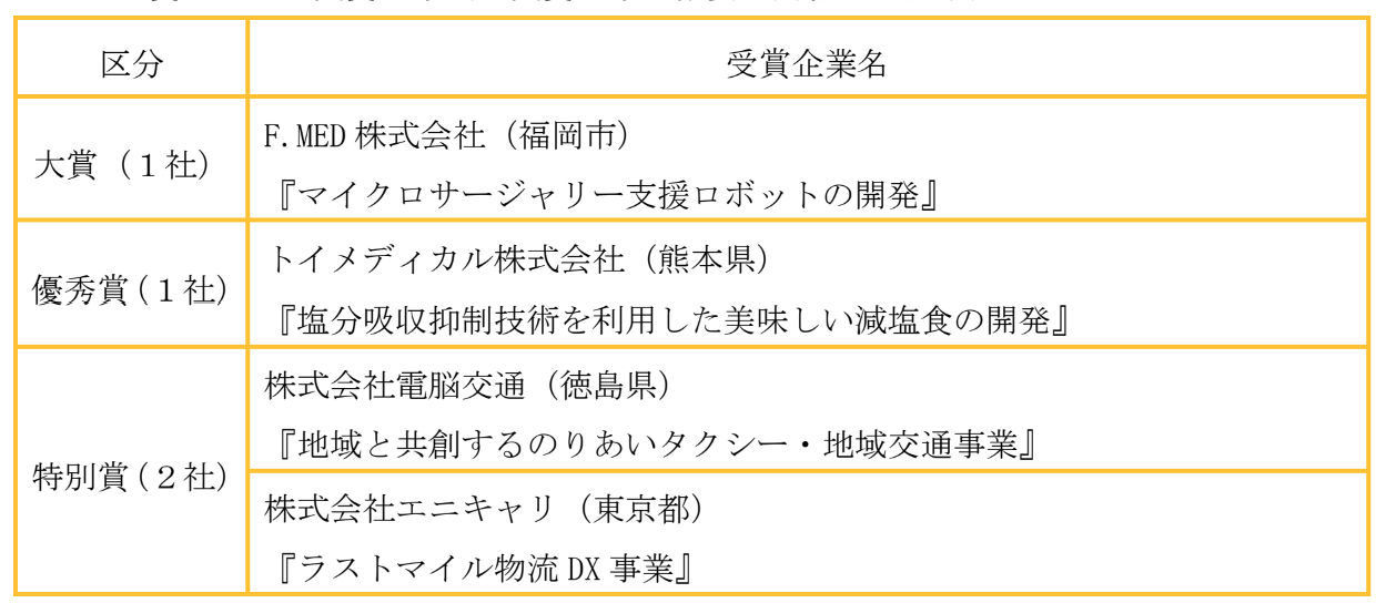 <大 賞> 優れたビジネスプランと経営手腕により、顕著な事業実績をあげ、その成果が登壇企業の範となるもの <優秀賞> 大賞に準ずるもの