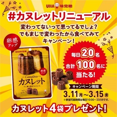 「#カヌレットリニューアル ~変わってないって思ってるでしょ?でもまじで変わったから食べてみてキャンペーン~」を2024年3月11日(月)10時から実施致します。UHA味覚糖公式X(@UMikakuto)で実施されるフォロー&リポストキャンペーンに参加頂いた方から毎日20名様に合計で100名様にリニューアルした「カヌレット」が当たるキャンペーンを実施します。