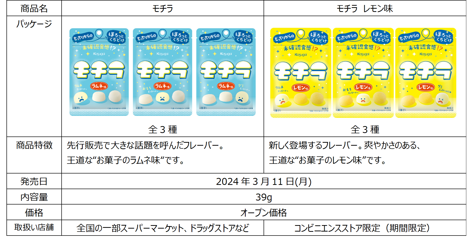 今回、生産体制を整え、3月11日(月)より全国の一部スーパーマーケット、ドラッグストアなどでも発売を開始いたします。なお、コンビニエンスストア限定で、新フレーバー『モチラ レモン味』を同時発売いたします。