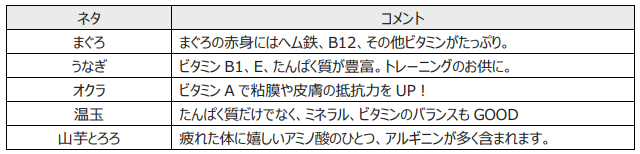 スポーツ選手や運動消費量が多い部活生、力を使う仕事をされる方などをターゲット層にして、活動後のエネルギー補給でコンディショニングを狙いとしたネタのチョイスにしました。シャリ(酢めし)を+150円で大盛りにすると、さらに糖質の補給もしやすくなるのでおすすめです!