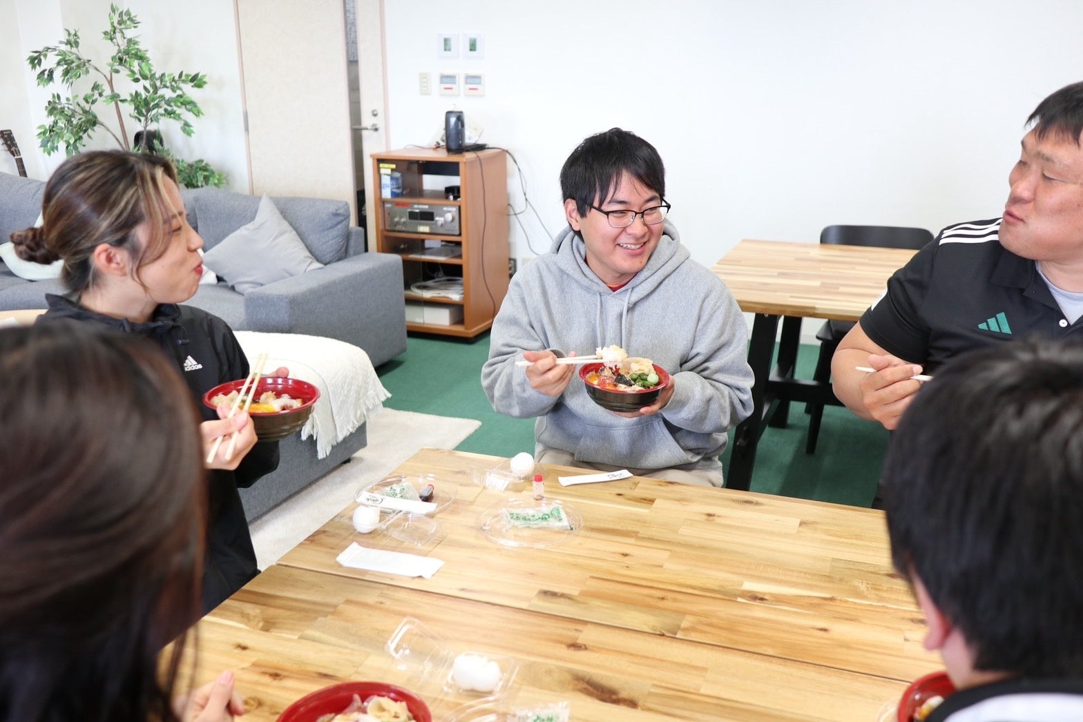 販売開始日となる3月11日(月)は、トヨタヴェルブリッツの練習場にて試食交流会を実施。将来スポーツの現場で働くことを目指す学生たちの「先輩」として、トヨタヴェルブリッツの栄養士や選手OBにもご参加いただき、オリジナル海鮮丼へのフィードバック以外にも、キャリアや仕事のやりがいについての質疑応答など学生たちと交流を行いました。