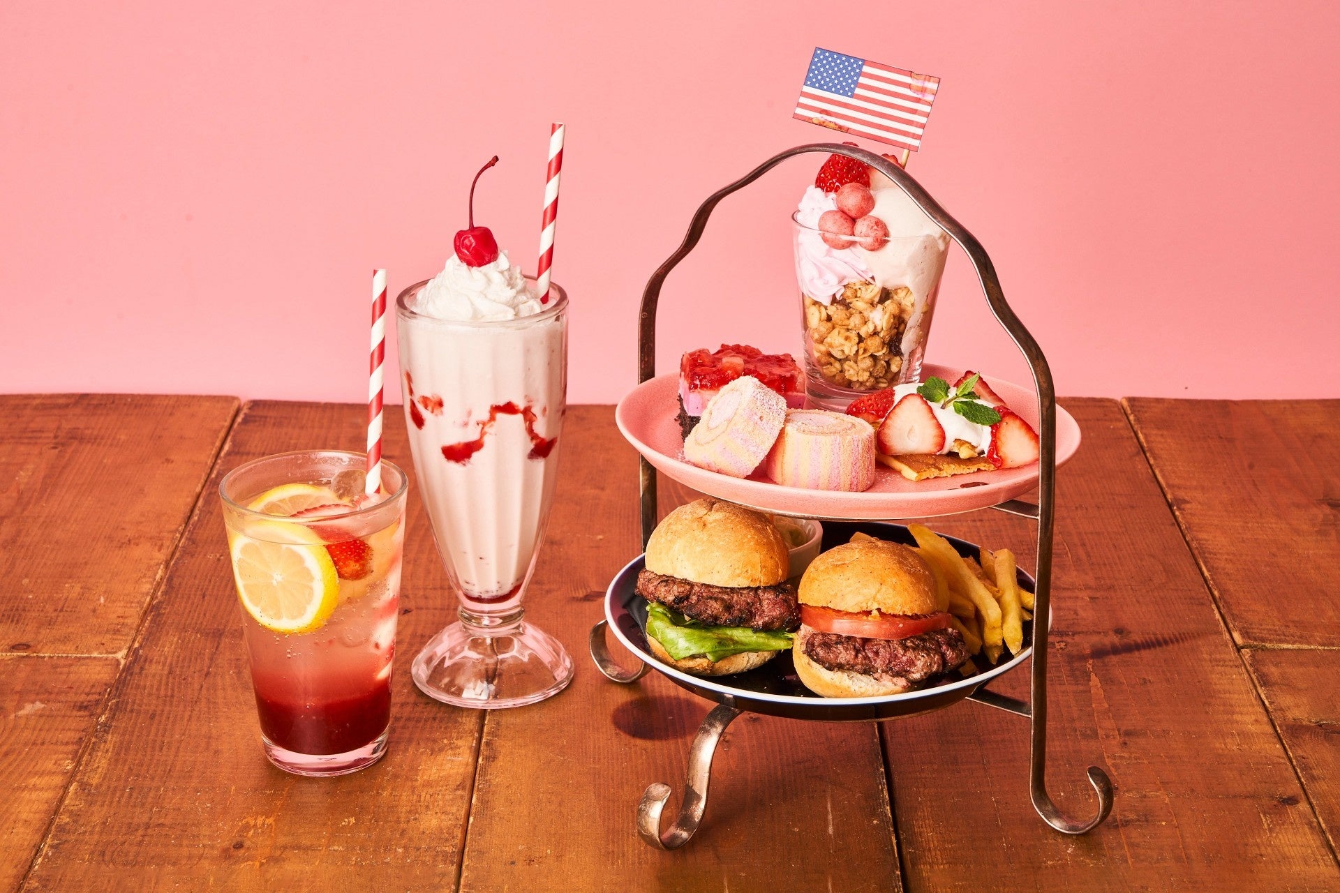 「ストロベリースイーツ&ミニバーガーのアフタヌーンティープラン」は、苺がたっぷり楽しめるストロベリーサンデーやストロベリージュレケーキなど、見た目も可愛らしい4種類のスイーツに加え、ミニバーガー・フライドポテト・キャロットラペのお食事メニュー、更にストロベリードリンクとソフトドリンク・カフェドリンクなど25種類のドリンク飲み放題がついた、リーズナブル価格のアフタヌーンティープランです。