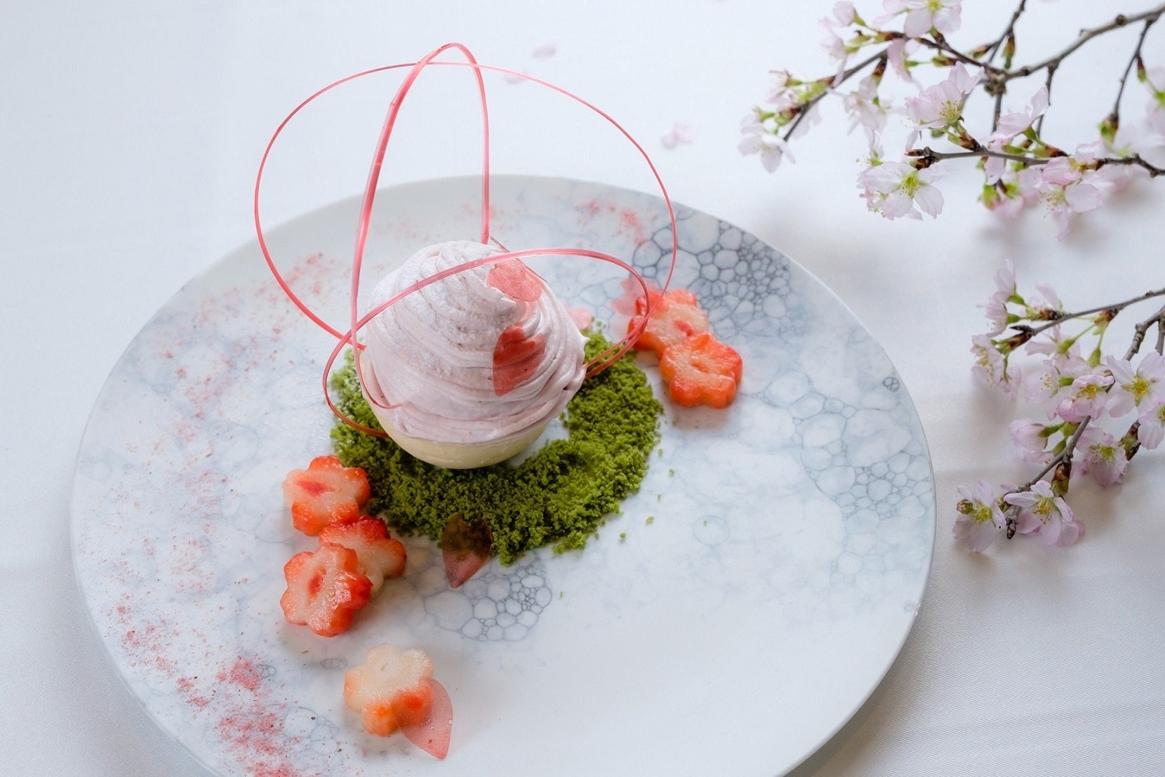 福岡・中洲川端「レストランひらまつ 博多」では、春の到来とともにお料理やデザートでも“おいしい春”をお楽しみいただけるよう3月8日(金)より春の新メニューがスタートいたしました。コースメニューの中でも今春、特におすすめしたいのが、季節限定のデザート「桜と大石農園あまおうのモンブラン仕立て 桜香るパルフェグラッセ」です。
