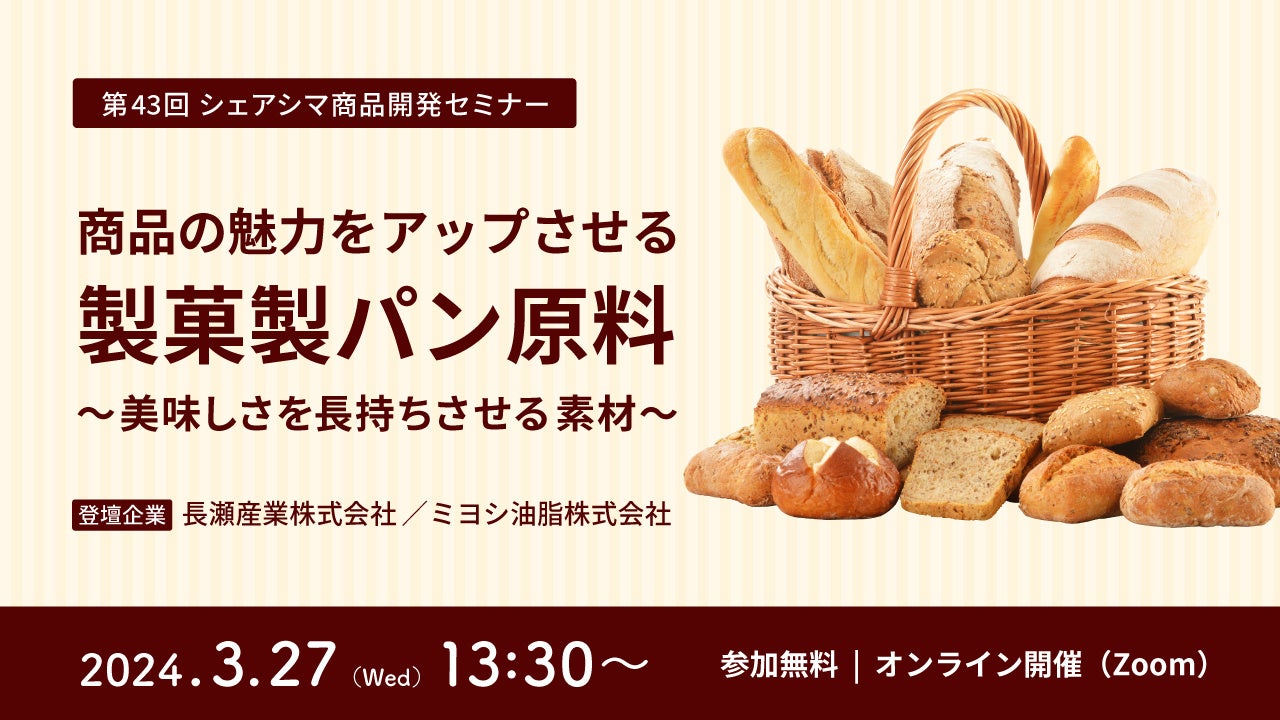 食品開発の中でも製菓・製パンに関心の高い方、パンやお菓子のおいしさを長持ちさせたい方、魅力的な食品原料をお探しの方などにおすすめのセミナーです。登壇企業の方々へ直接質問できるコーナーもございます。ぜひ、ご参加ください。