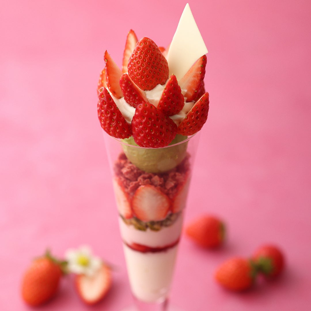 たっぷりの苺の果実をお花のように飾った「苺とピスタチオのパフェ」は、フレッシュ苺、フレーズシャンティ、ココナッツゼリー、苺のクランチ、ピスタチオアイスなど、様々な味わいを何層にも重ねています。ピスタチオアイスが味わいや見た目のアクセントになって、春を感じる華やかな一品になりました。