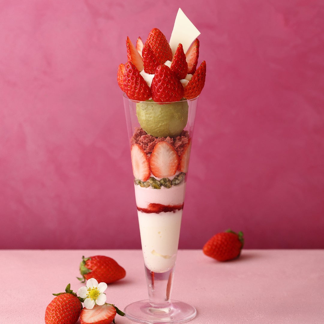 たっぷりの苺とピスタチオアイスに、甘酸っぱい苺のクランチとやさしい甘さのココナッツゼリーを合わせた、春色のパフェ。