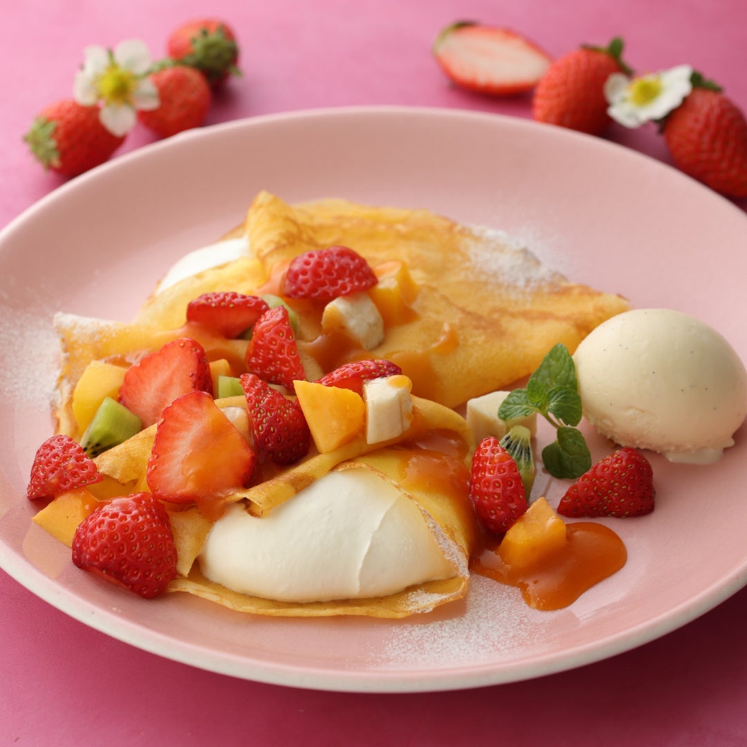 焦がしバターを加えてこんがりと焼いた自家製クレープに、クレーム・シャンティを包みました。苺をメインにキハチトライフルロール®のフルーツとバニラアイスを合わせた、春のクレープ。