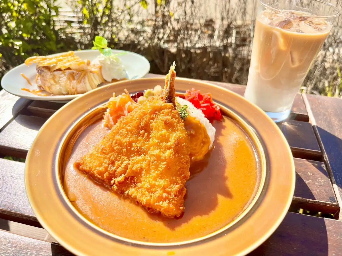 油が乗ったアジフライと人参のラペ、ミックスビーンズのサラダをトッピングしたカレーです。