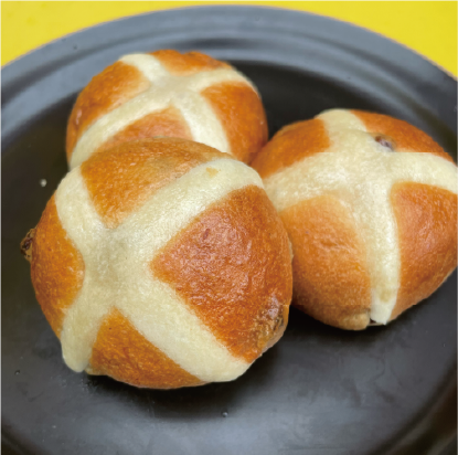 レーズンやカレンズ(小粒のレーズン)などのドライフルーツやスパイスを加えた生地に、十字の模様をかたどって焼き上げた甘さのあるパンです。この特徴的な十字の印は、キリストの十字架に見立てたものとされていますが、このパン自体はキリスト教が伝わる以前から、春を祝う時に作られていたという説もあり、春の訪れを感じられるパンとも言えます。