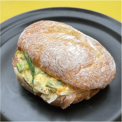 (南麻布店ベーカーより)外国人のお客様の割合が高い南麻布店は、サンドイッチ系アイテムがとても人気です。そこで、常時ご提供しているパニーニ系とは一味違った、よりフレッシュなサンドイッチを考案しました。生ハムのピンク色とたまごの黄色で、色味を春っぽさを意識しています。
