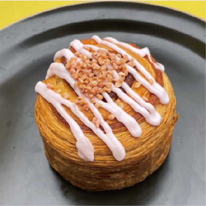 クロワッサン生地に桜餡を巻き上げたロール。トッピングには、桜のリキュールを混ぜたピンクのアイシング・ラズベリーを混ぜたアーモンドクラックランを使用しています。