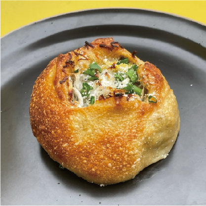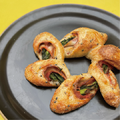 北海道十勝 前田農産様のキタノカオリを生地に使用し、鰹節と白ゴマ・黒ゴマを練り込みました。菜の花とベーコンを包み、花形をイメージして焼き上げました。