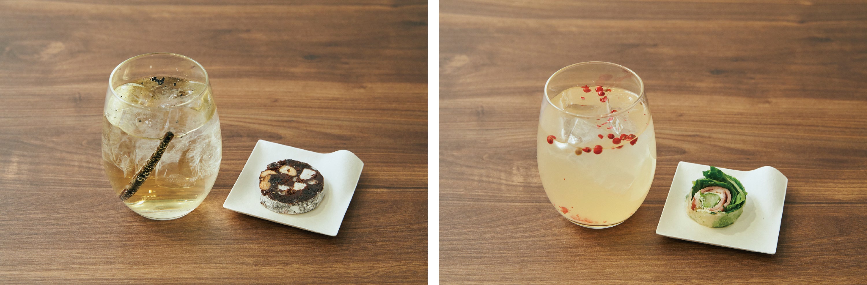 【写真右】ジンジャーペッパーハイボールと アスパラベーコンとマスカルポーネの生春巻き