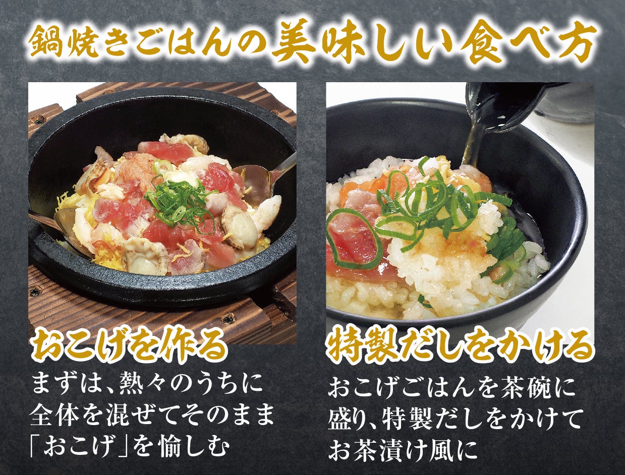 『鍋焼きごはん四六時中』は、「ジュージュー」沸き立つ音、香ばしい匂い、そして「パリパリ」とした食感が特徴の、熱々の鉄鍋でつくる「おこげ」が五感で愉しめるお店です。シンプルな「温玉鍋焼きごはん」をはじめ肉系、海鮮系など12種類のバリエーションをご用意。さらにトッピングのカスタマイズも取り揃えています。最後は自慢の特製だしでお茶漬けとして絶妙なおこげの食感をお愉しみいただけます。