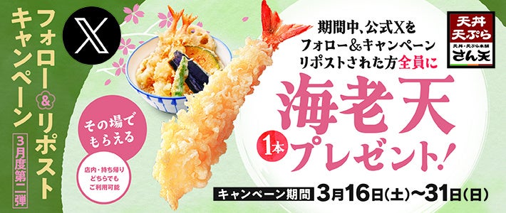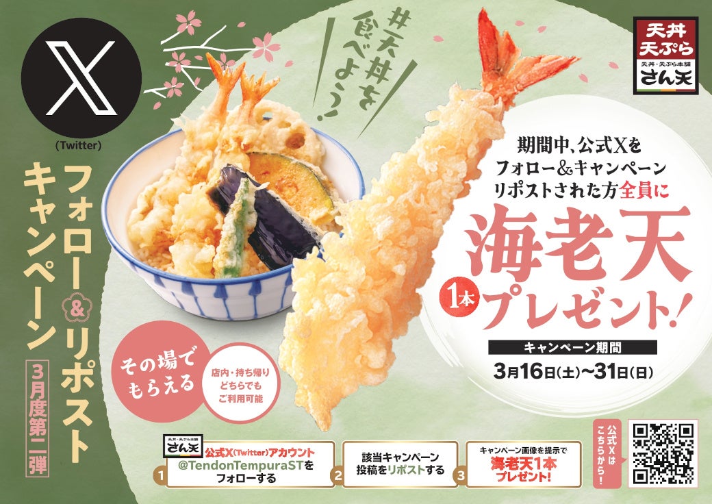 サトフードサービス株式会社(本社・大阪府大阪市、代表取締役社長・杉本 貴之)が運営する「天丼・天ぷら本舗 さん天 」では、2024年3月16日(土)~3月31日(日)まで、公式X(Twitter)アカウントをフォローし、キャンペーン投稿をリポストすることで、海老天(1本)がその場でもらえるキャンペーンを期間限定で開催します。簡単に応募でき、期間中に何度でも「海老天(1本)」がもらえる大変お得なキャンペーンですのでぜひご利用ください。