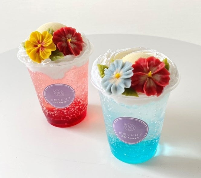 さわやかな海を表現したブルーハワイと、サンセットをイメージしたストロベリーの2種類をご用意しております。ソーダの上には、アイスクリーム・ホイップクリーム・餡で絞ったハイビスカスをのせています。