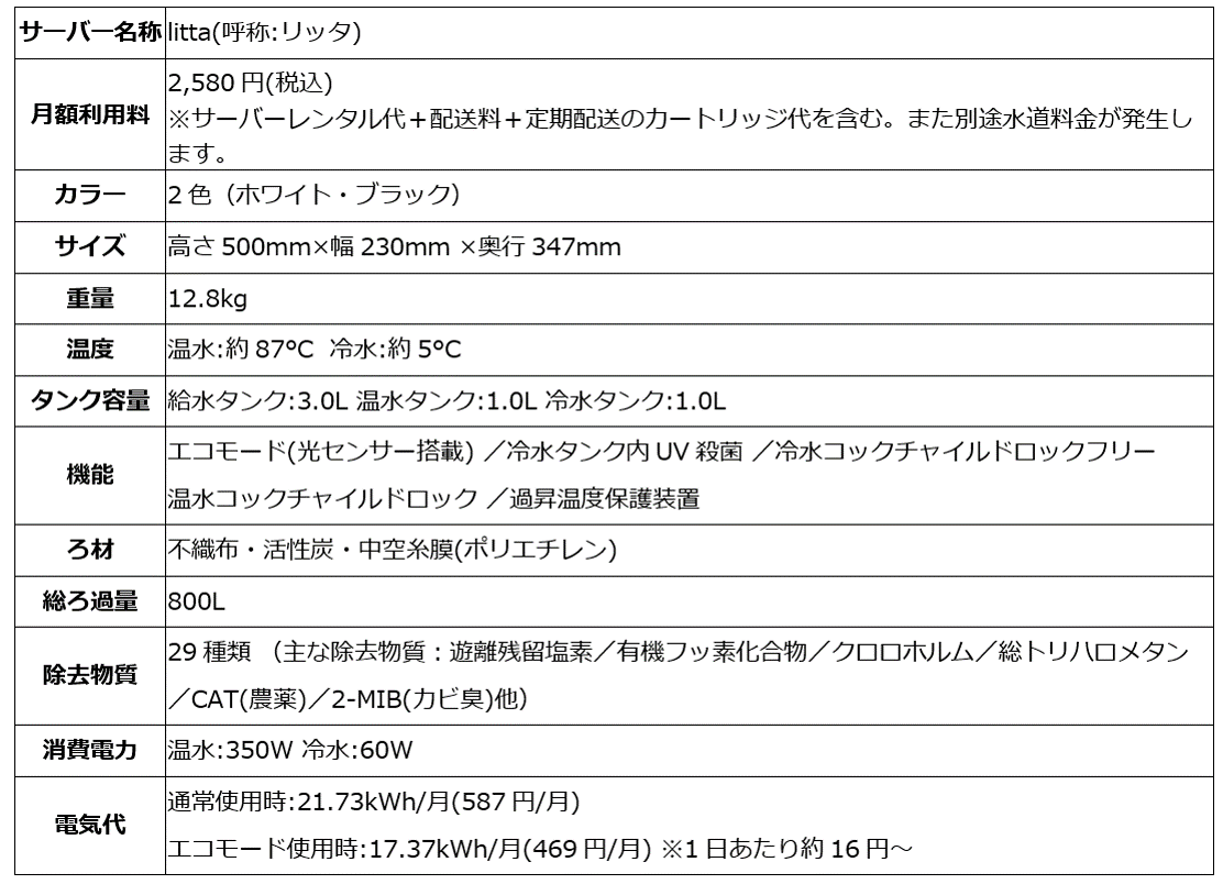 ■『litta』のポイント ・2021年以降、ウォーターサーバー業界から続々と「浄水型」が登場し好調の中、当社の浄水型ウォー ターサーバーブランド「Locca」より、卓上タイプのコンパクトな浄水型ウォーターサーバー『litta』が 誕生。 ・サーバーレンタル代+配送料+カートリッジ代全て込みで業界最安級の月額2,580円(税込)。 ・水道水に含まれるミネラル成分を残したまま、29種類の不純物を除去。 ・優れたろ過能力で、カートリッジ交換頻度は8か月に1回(総ろ過量800L※使用目安:約3.3L/日)。 ・キッチンやテーブルに常設しやすい、幅23cmのスリム設計。 ・光センサーのエコモード搭載で月々の電気料金を節約。 ・UV殺菌機能搭載のため、 冷水タンク内を自動でUV殺菌しお水を衛生的に保てる。 ・タンク本体を丸ごと取り外すことができてお手入れ簡単。 ・温水には、いたずらややけどを防ぐチャイルドロック搭載の安心設計。 |