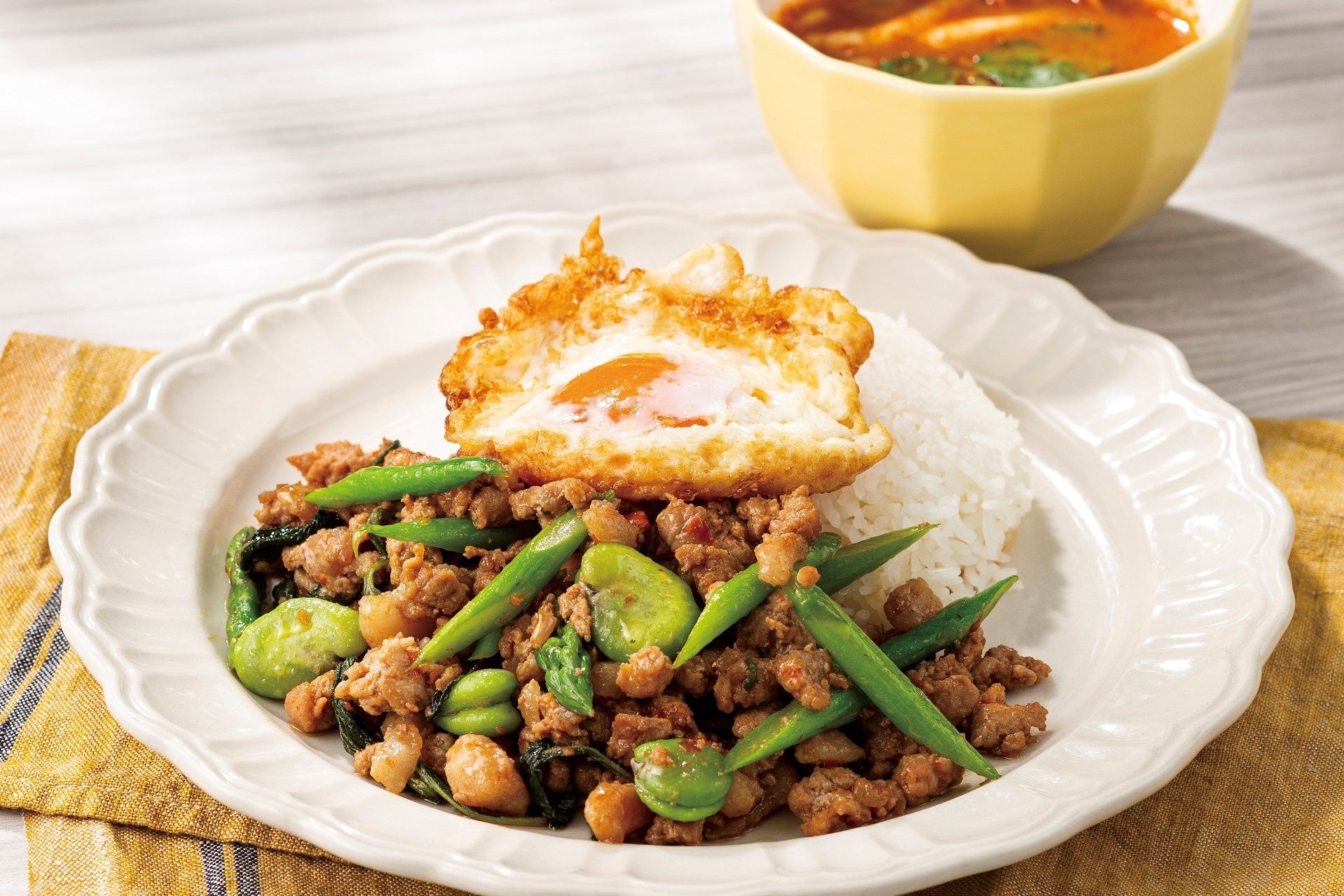 タイハーブ“ガパオ”の爽快な香りとスパイシーさが人気の「豚のガパオ」にそら豆やアスパラガスのグリーンが映える春らしい装いのガパオ。春野菜のシャキシャキ&ホクホクな食感も楽しめる春を感じる一皿です。