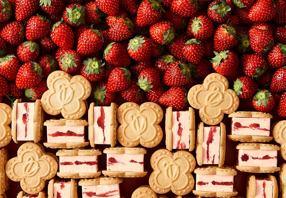 実の中まで赤く熟す“カマロッサ種 苺”の果肉を苺のピューレで煮込んで仕立てた、苺本来の甘みと酸味を味わえる苺コンフィチュールジュレに、爽やかな苺ホイップバタークリーム。ダブルの苺の美味しさをとろとろ混ぜて贅沢な厚みのまま、発酵バター香るクッキーではさみました。バターのコクがスッと軽やかに口溶けて 苺の甘酸っぱさが口いっぱいに広がる、味わいリッチな極厚バターサンドをたっぷりご堪能ください。