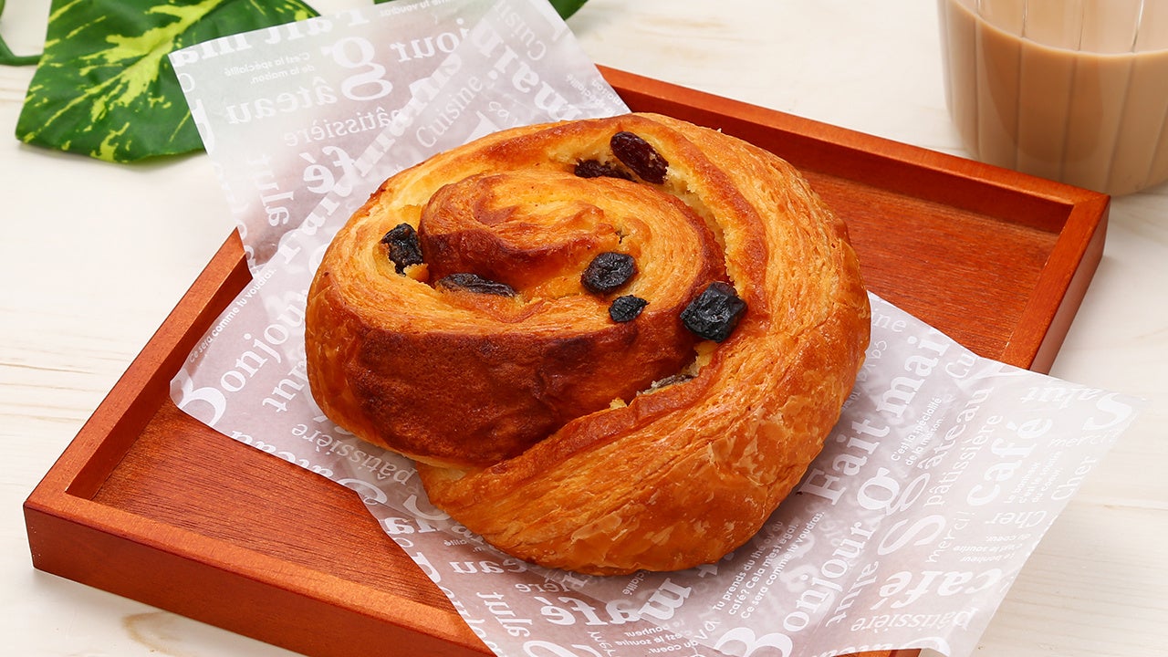 フランス語で「レーズン入りのパン」という意味のパン・オ・レザン。さっくりとしたデニッシュ生地と、甘くしっとり食感のケーキ生地を合わせ、レーズンを巻き込み焼き上げました。ほんのり甘いパンの中で、レーズンの酸味が引き立ちます。