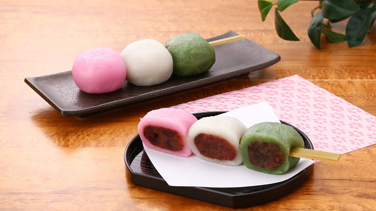 常識外れの大きさが特長の、1個55gのつぶあん入り三色団子です。コシのある生地にたっぷりあんこが詰まっていて食べ応え抜群です。お花見シーズンにぜひお楽しみください。
