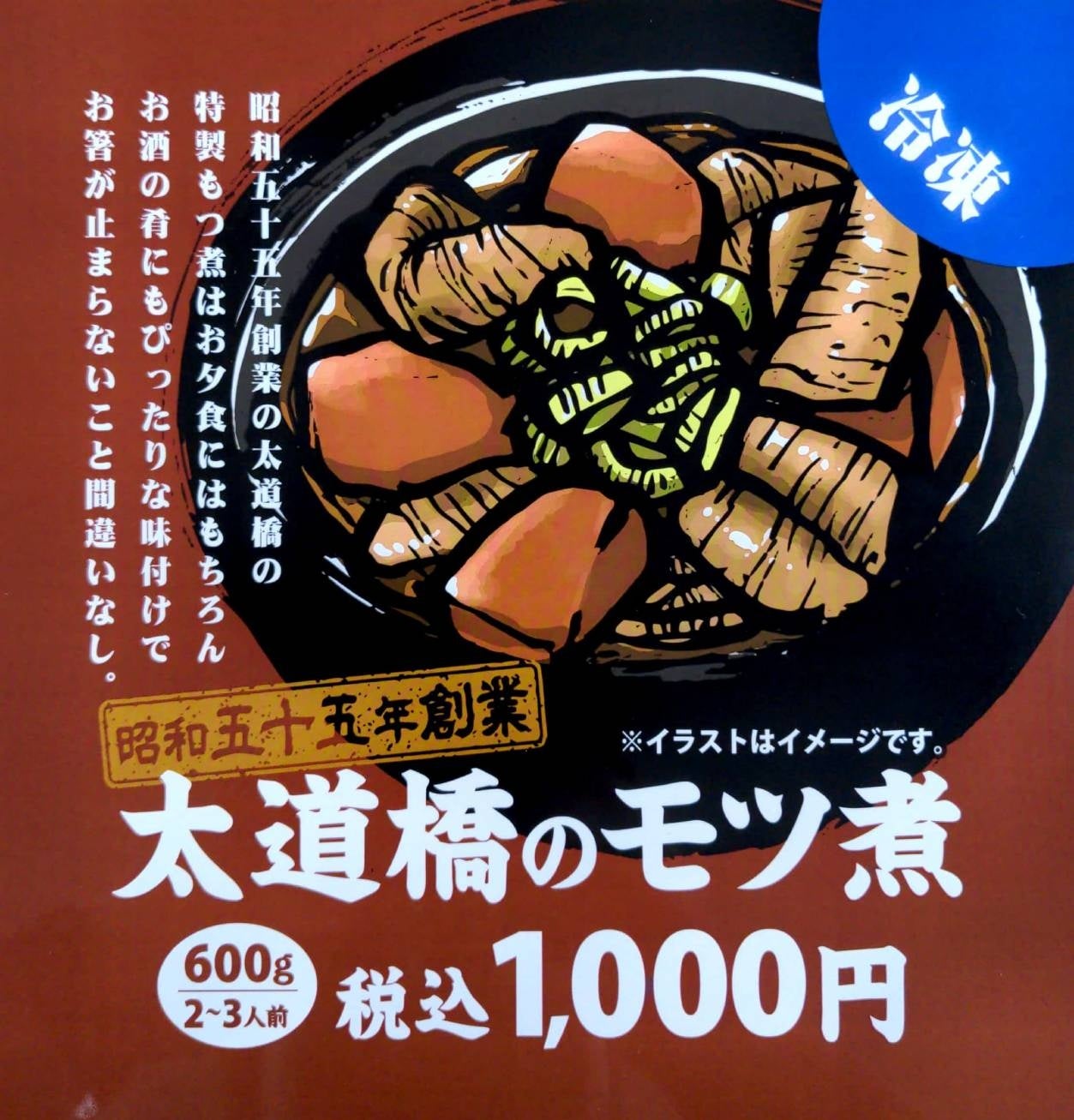 昭和五十五年創業の太道橋の特製もつ煮は夕食にはもちろん、お酒の肴にもぴったりな味付けでお箸が止まらないこと間違いなし。