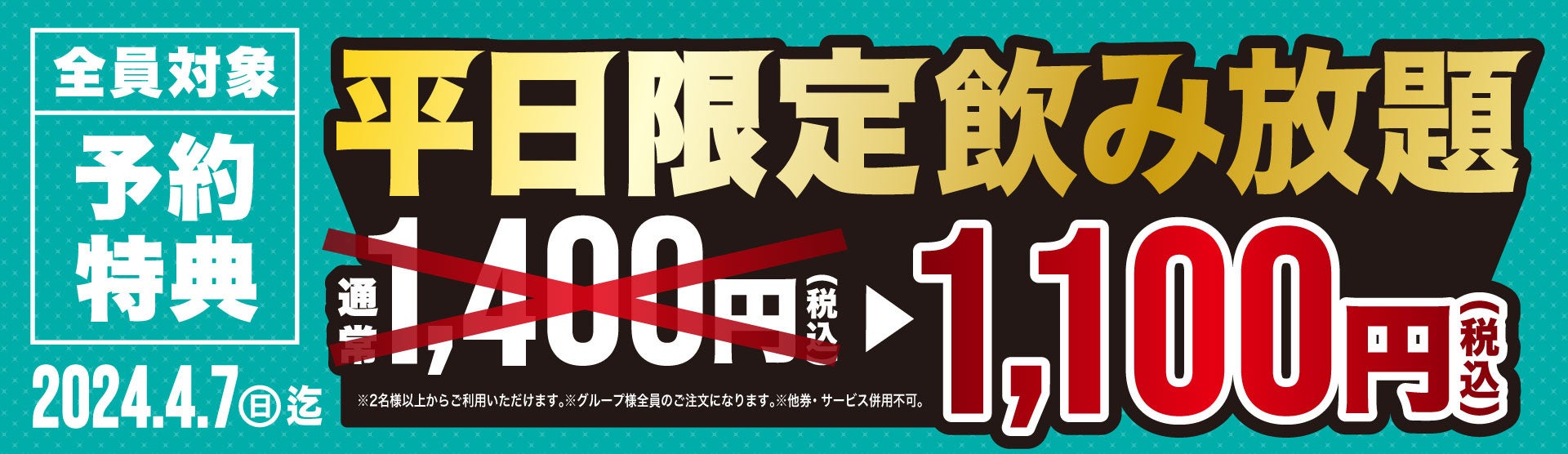 春の歓送迎会をご予約いただいたお客様限定で、平日の飲み放題が1,400円(税込)→1,100円(税込)でご利用いただけます。