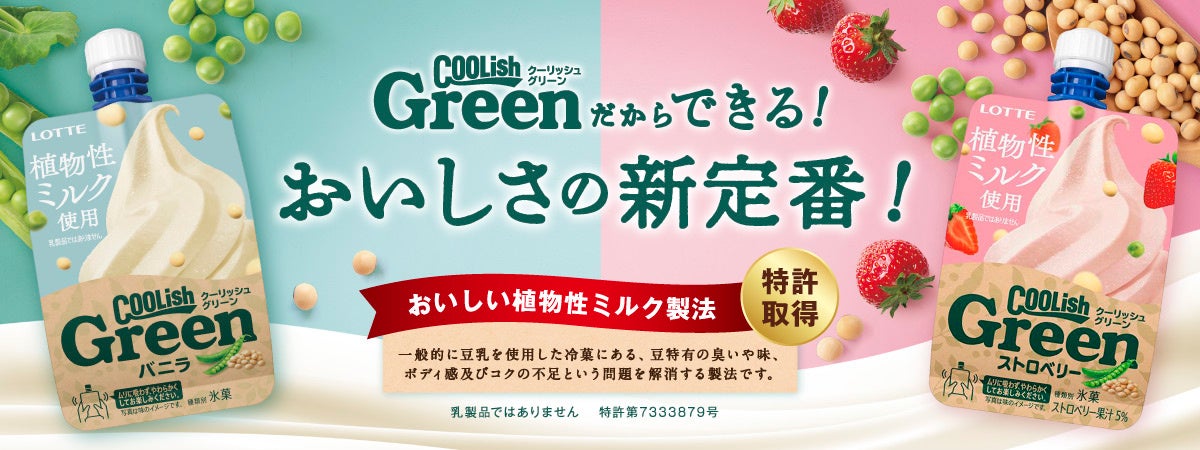 『クーリッシュGreen』2品(バニラ・ストロベリー)に使用! 「おいしい植物性ミルク製法」特許を2023年7月に取得! |
