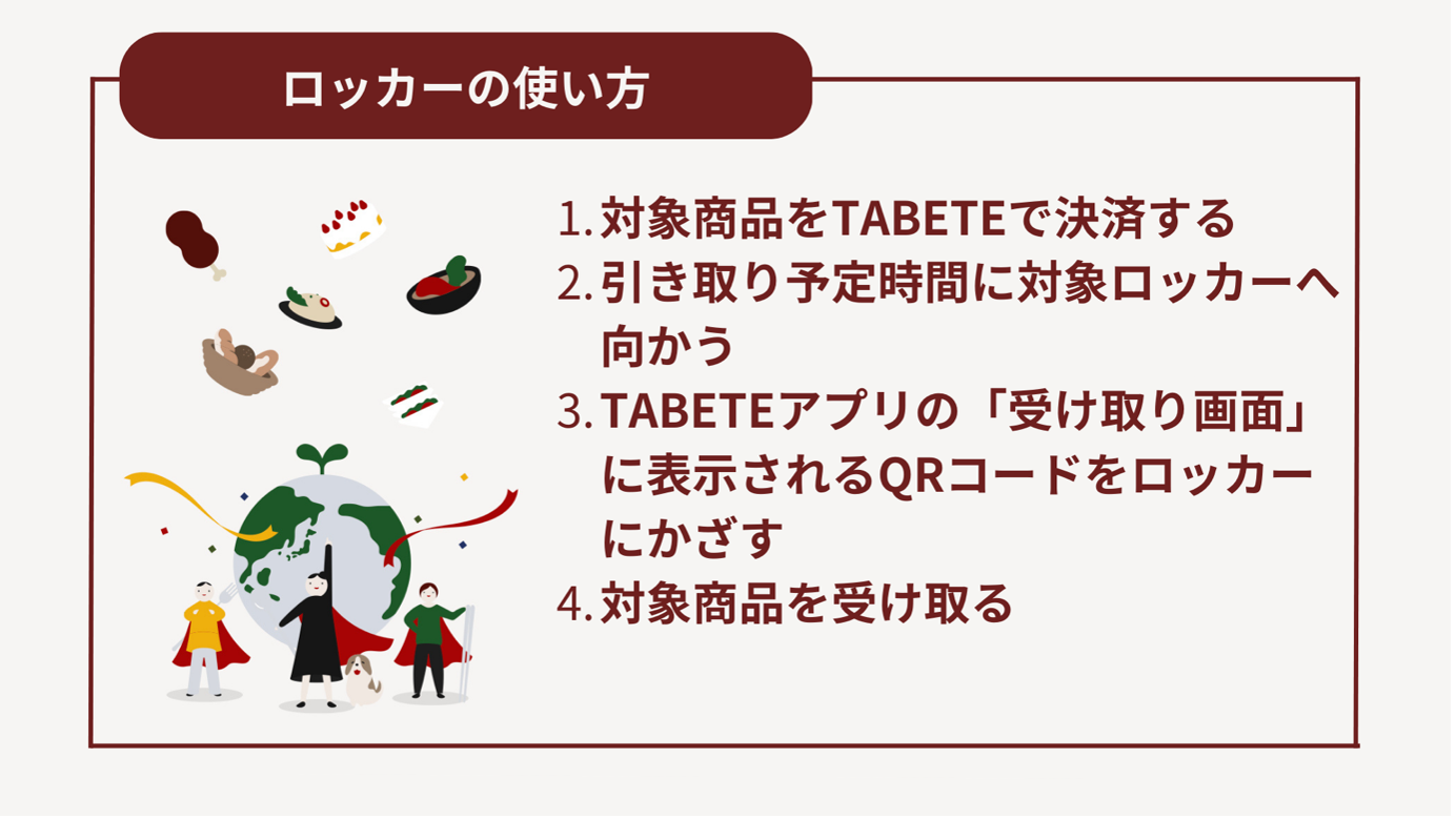 このたび、営業時間終了後の食品ロス削減を目的として、ロッカーを活用した無人の受け渡しの実証実験を池袋駅にて実施するに至りました。今回の実証実験は、東武鉄道による場所の提供、東武百貨店内のTABETE加盟店舗の参加、アルファロッカーシステムによるロッカーの提供・開発、コークッキングのTABETEの活用と4社共同で実施いたします。