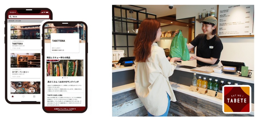 TABETEは、パン・ケーキ店、ホテル、飲食店、スーパー等のお店で、まだおいしく安全に食べられるのに「食品ロス」の危機に面している食べものレスキュー価格で、ユーザーとマッチングするアプリです。「フードシェアリング」と呼ばれるこの仕組みを通し、お店は無駄を減らして売上を増やすことができ、ユーザーもおいしく食べながら社会貢献ができます。