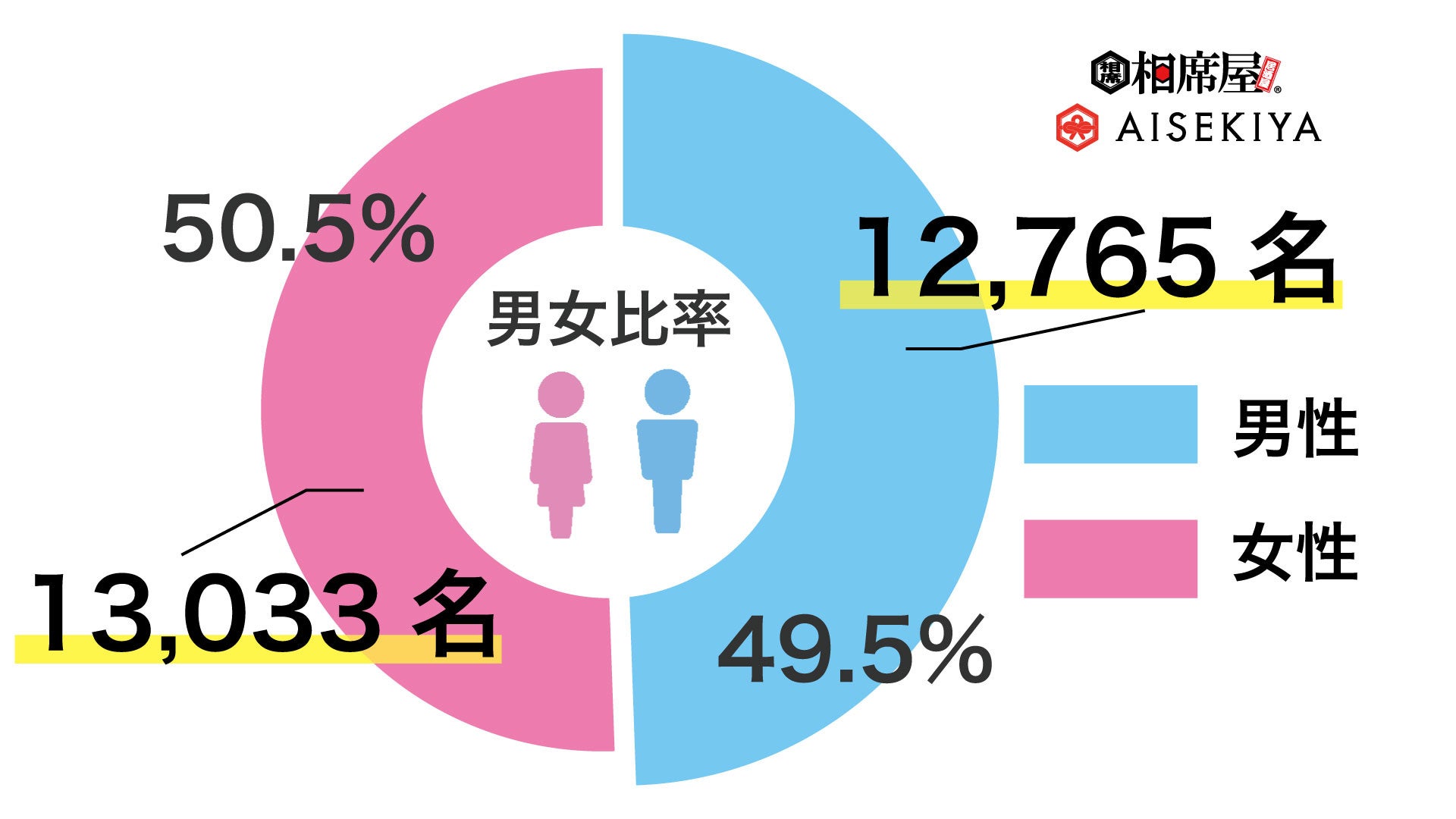 2024年2月の相席屋への男性来店数は12,765人、女性来店数は13,033人を突破。男性49.5%、女性50.5%でした。また、男性来店数のうち初めて来店した男性は3,806人、2回以上来店した男性は8,959人、女性来店数のうち初めて来店した女性は4,009人、2回以上来店した女性は9,024人でした。