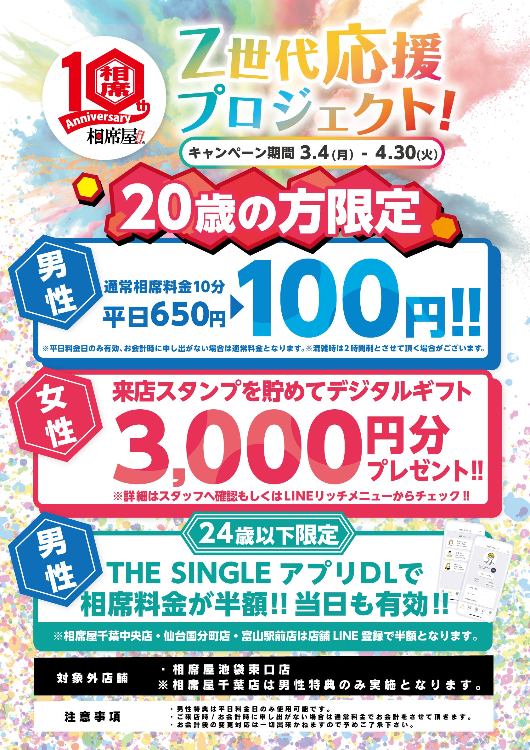 また10周年を迎え、さらにZ世代含む多くの方に相席屋を知っていただきたくZ世代若者応援キャンペーンも同時に開催いたします。