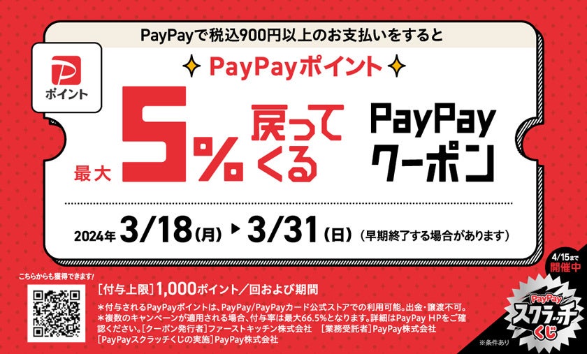 対象:「PayPay」で税込900円以上のお支払いで、最大5%の「PayPayポイント」付与