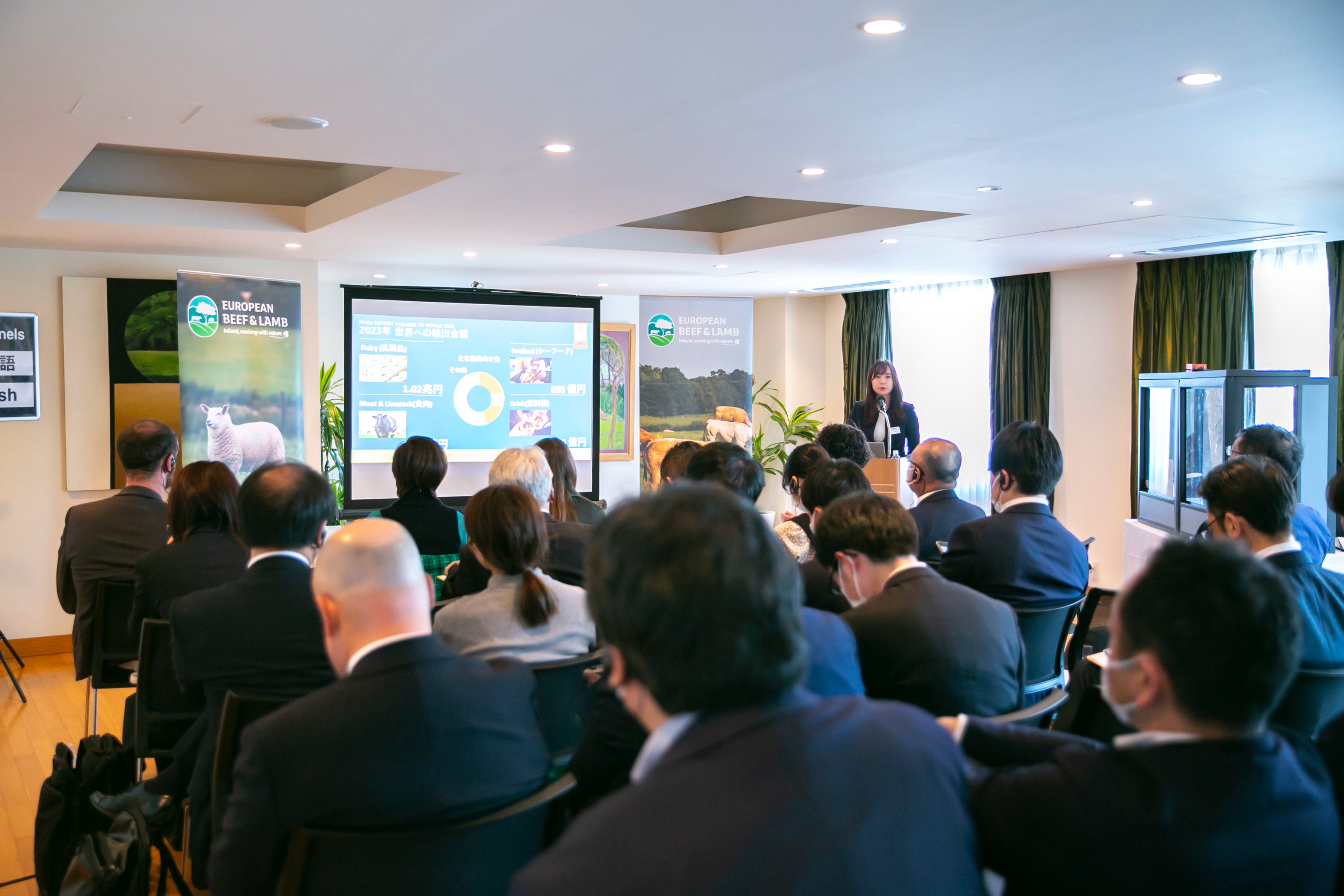 セミナーでは、日本市場スペシャリストのカレン・バリフ氏がボード・ビアの日本での活動報告をアップデート、続いて、この日のために来日した、ボード・ビア食肉セクター代表のショーナ・ジャガー氏が繁殖技術を中心に、最新のヨーロピアン ビーフ&ラム・セクターの展望、アイルランドの酪農家は伝統と最先端技術を融合させ、肉牛繁殖の最適化と効率化を図っていること、アイルランド肉牛生産者連盟(ICBF)は、すべての家畜の遺伝的価値を評価するDairy Beef Indexを提供しており、酪農家は、分娩が容易で、妊娠期間が短く、体型の良い、より良い肉を生産するための選択方法を知ることができることなどを説明しました。そして、調査会社GIRAマーケット・アナリストの西出香氏は、日本の食肉産業が直面している輸入の課題を掘り下げ、将来の需要に関する鍵となる洞察を発表しました。セミナーの後、実施されたネットワーキング・レセプションには、業界関係者34名の参加をいただき、ヨーロピアン ビーフ&ラムのお料理を堪能しました。