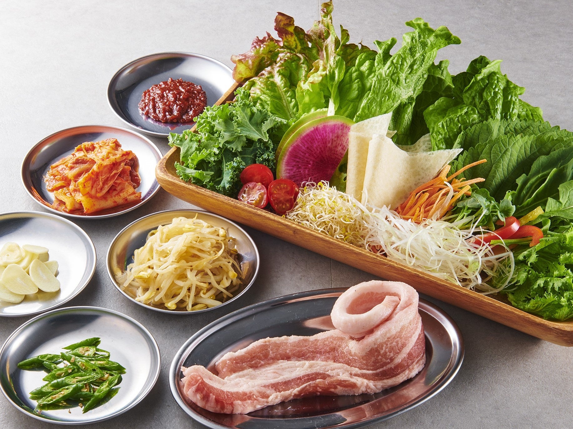 焼肉くるとんの名物であるサムギョプサル。こだわりの特製タレと新鮮野菜で包んで召し上がってください。