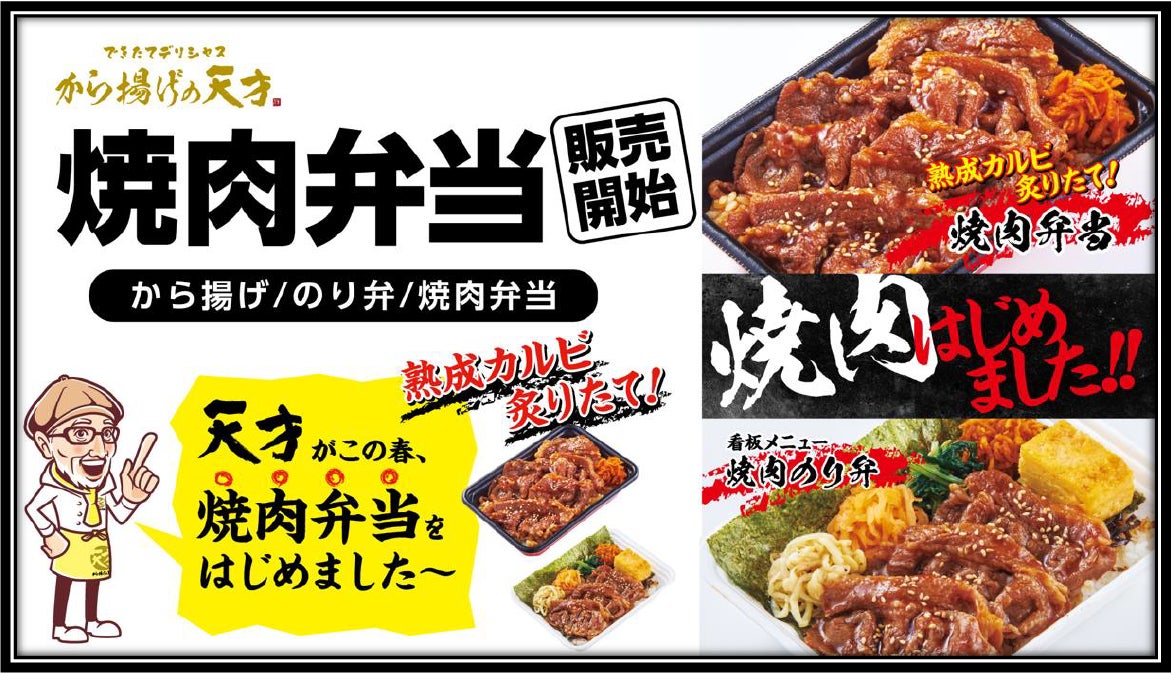 揚げたてから揚げとテリー伊藤こだわりの玉子焼き「から揚げの天才」は、この春「焼肉弁当」を導入いたしました。2024年2月15日(木)梅屋敷店、3月1日(金)大鳥居トレーニングセンター店の2店舗でサイレントに先行導入し、本日までで売上平均20%アップ!焼肉メニューはすべて、タレに付け込んだ「熟成肉」を、ご注文を頂いてから、お店で炙ります!! だから美味しいんです。 焼肉弁当、焼肉ビビンバ、焼肉のり弁、のりカルビ弁当など、メニューもたくさんございます。もちろん自慢のから揚げや玉子焼きも変わらずお選びいただけます。