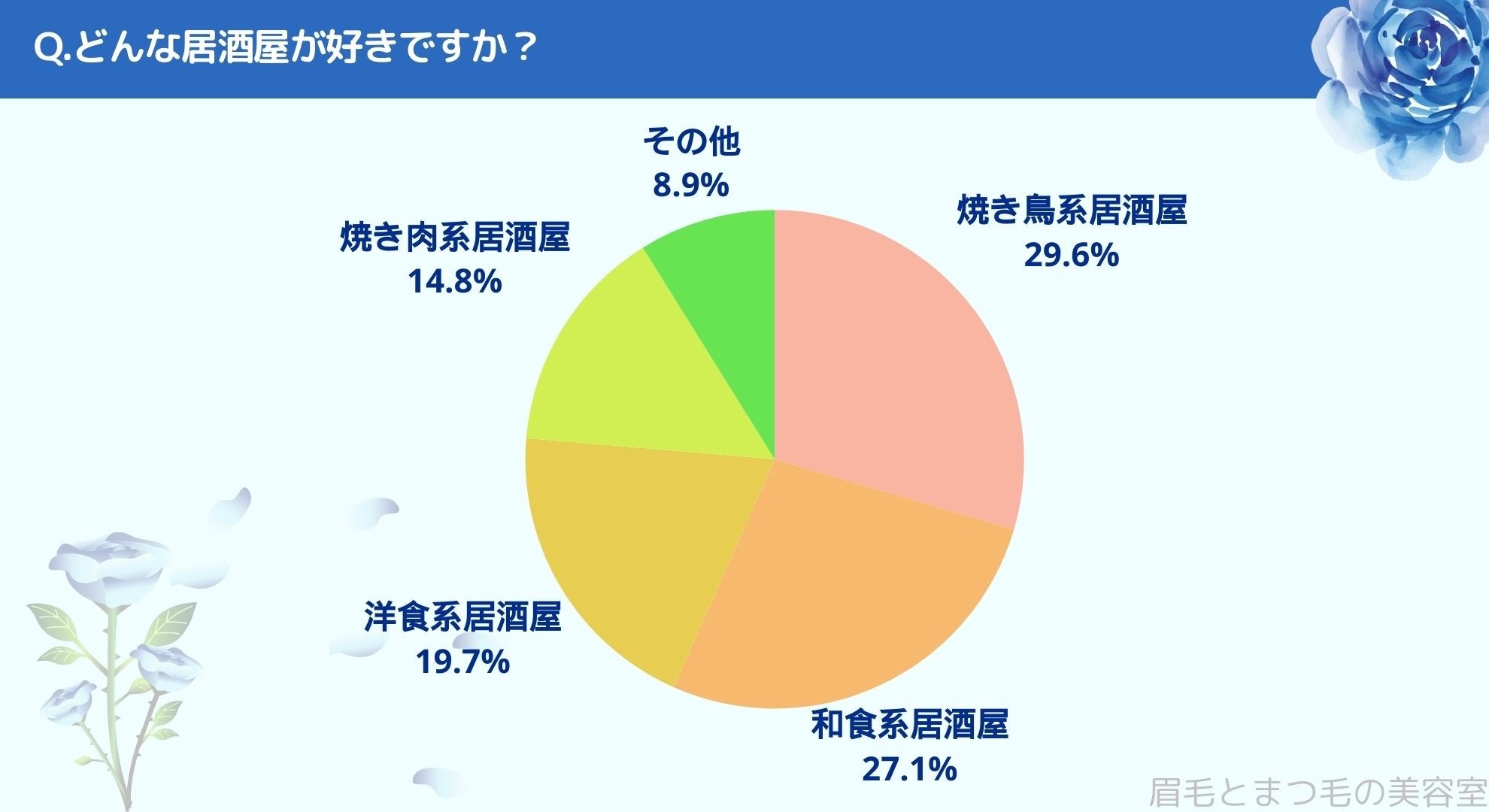 どんな居酒屋が好きかお聞きしたところ「焼き鳥系居酒屋(29.6%)」、「和食系居酒屋(27.1%)」、「洋食系居酒屋(19.7%)」、「焼き肉系居酒屋(14.8%)」という結果になりました。