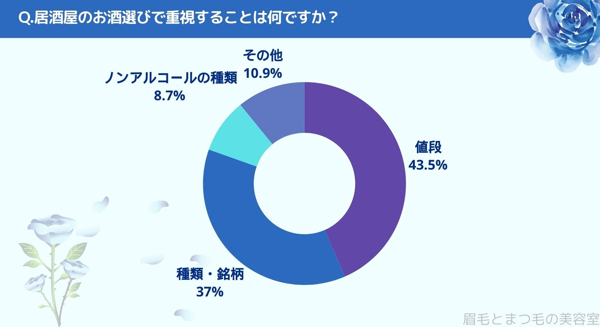 居酒屋のお酒選びで何を重視しているのかお聞きしたところ「値段(43.5%)」、「種類・銘柄(37%)」、「ノンアルコールの種類(8.7%)」、「その他(10.9%)」という結果になりました。