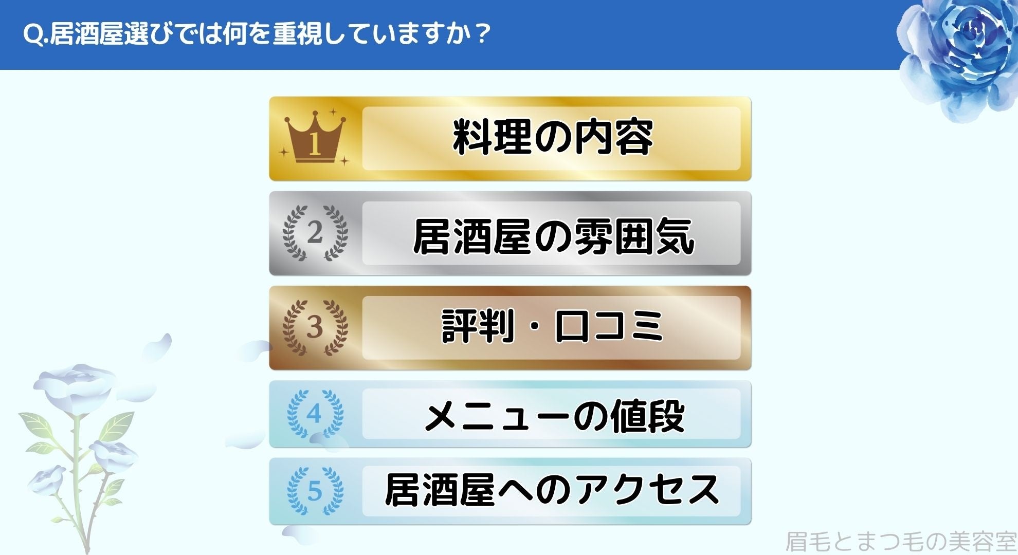 居酒屋選びで何を重視しているのかお聞きしたところ「1位>料理の内容」、「2位>居酒屋の雰囲気」、「3位>評判・口コミ」、「4位>メニューの値段」、「5位>居酒屋へのアクセスという結果になりました。