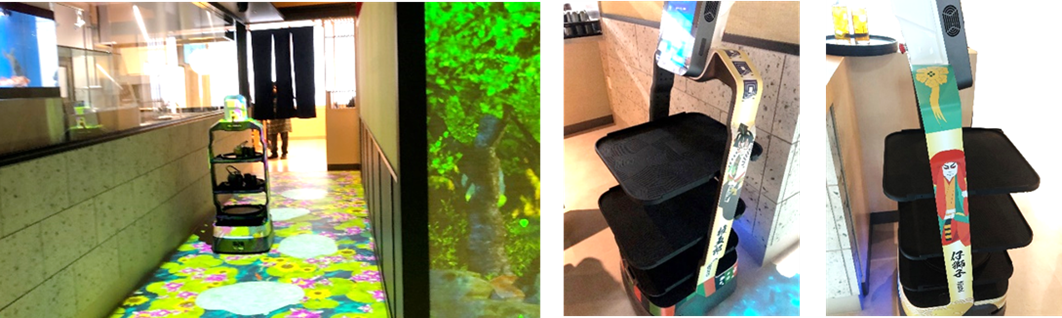 「鮨 Yasuke」豊洲千客万来店は、日本伝統食文化「鮨」を江戸と現代を融合させた空間で楽しめる店舗となっており、配膳AIロボットにも歌舞伎をイメージした装飾を施し、お店の雰囲気作りに一役かっています。