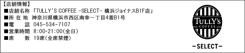 今回オープンする「TULLY’S COFFEE -SELECT- 横浜ジョイナスB1F店」は、横浜駅西口にある大規模ショッピングセンター「JOINUS(ジョイナス)」B1フロアに位置します。お買い物の休憩や、お仕事帰りに一息つける場所として、ぜひお立ち寄りください。