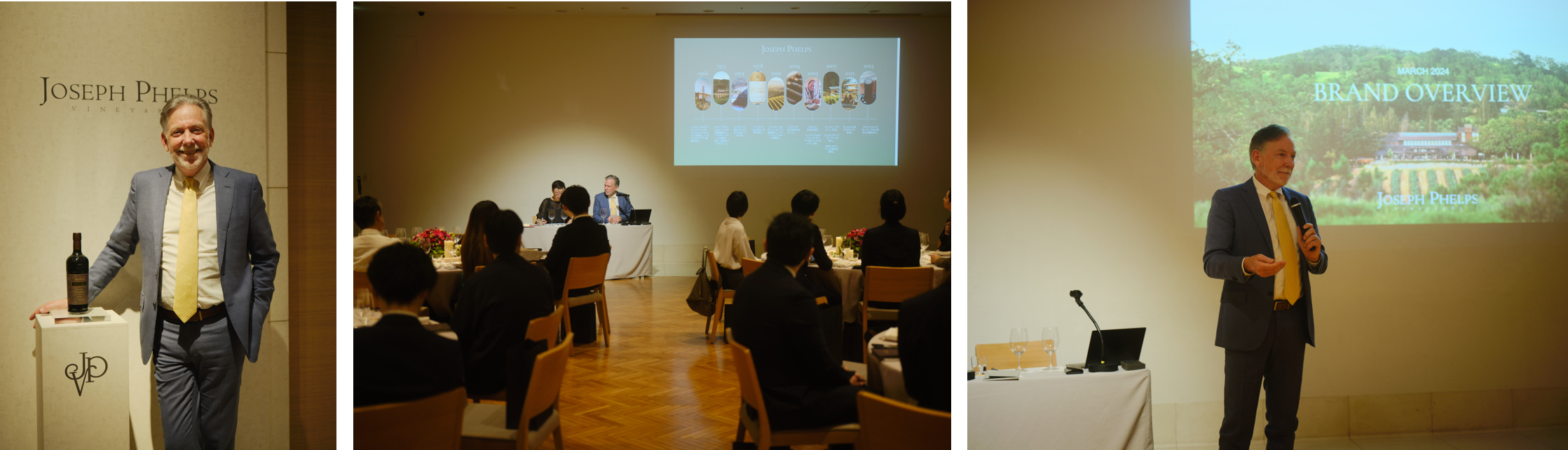 デイヴィット・ピアソンはこの日のためにカリフォルニアより来日し、「ジョセフ フェルプスは、創始者にインスパイアされ、ワイン造りへの情熱を持った人々が造り上げる、エレガントな中にも複雑さを持った素晴らしいワインです。私は長年のワイン造りを通して、自然へのリスペクト、長年の熟成を待ちわびる根気強さ、そして何事にも通じるバランスの良さを学びました。多くの皆様にジョセフ フェルプスを愛していただけるよう、ワイナリーの伝統やレガシーを大切にしつつ、これからも革新的なワイン造りを続けていきたいと思っています。」とジョセフ フェルプス ヴィンヤーズの魅力を語りました。